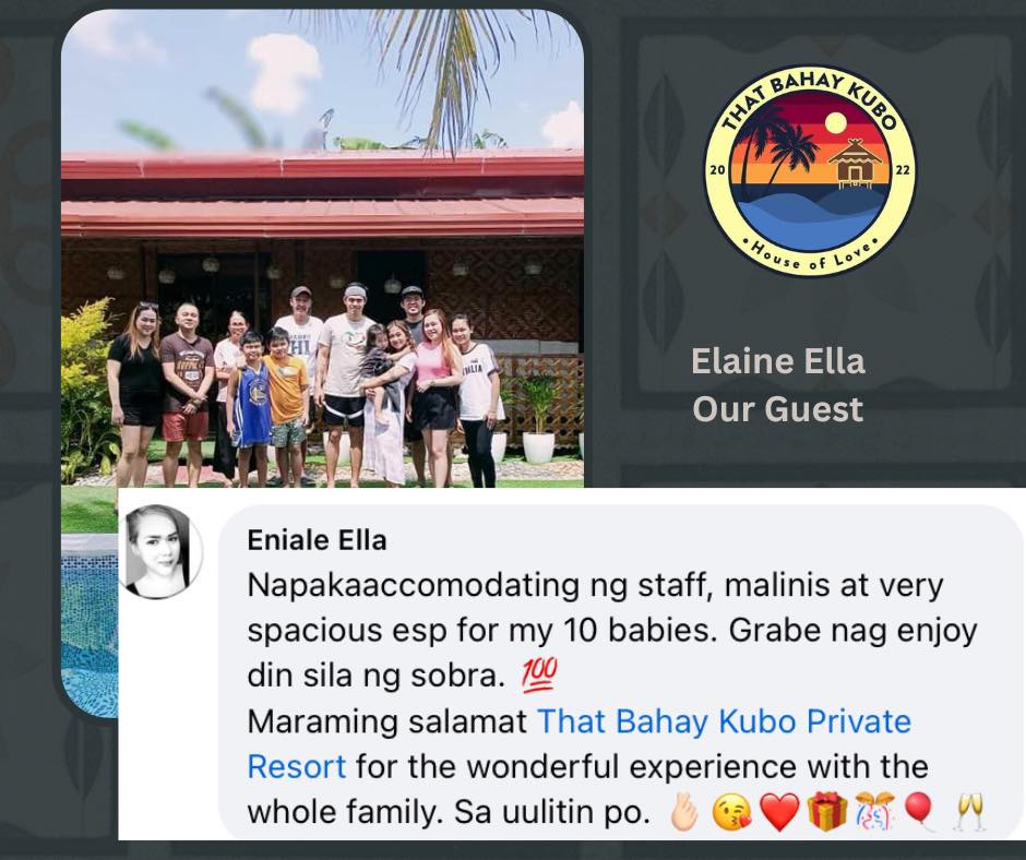 At That Bahay Kubo – The House of Love Private Resort, every moment spent here becomes a memory worth capturing. Our gallery is a window into the heart of our resort, where laughter, love, and connection come alive. Step into our world through these photos, where every snapshot tells a story of joy, celebration, and togetherness.